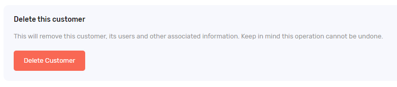 You can delete a customer by clicking on ‘Permissions’ from the customer menu and then pressing the ‘Delete Customer’ button.