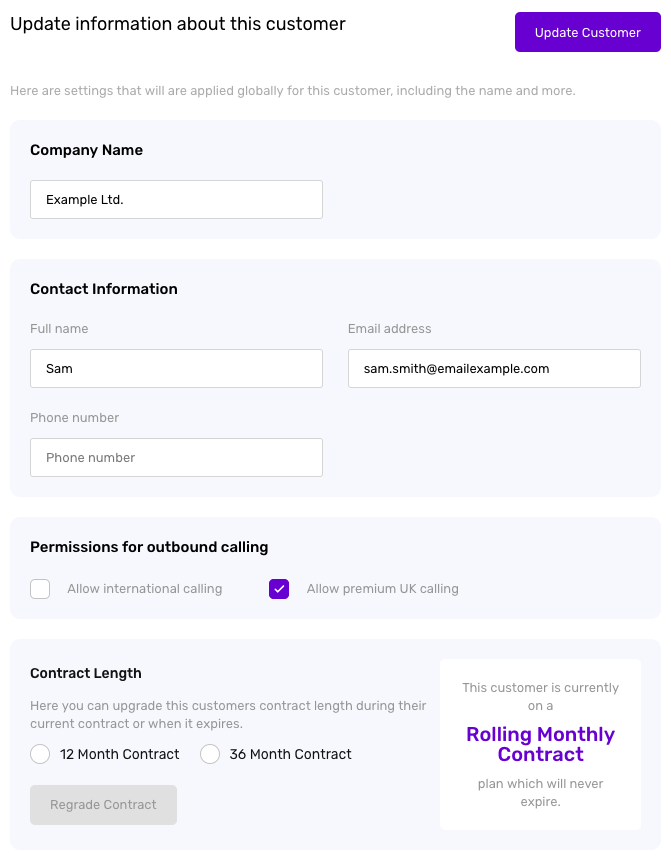 - Customer permissions for outbound calling (whether they can make international / premium UK calls)