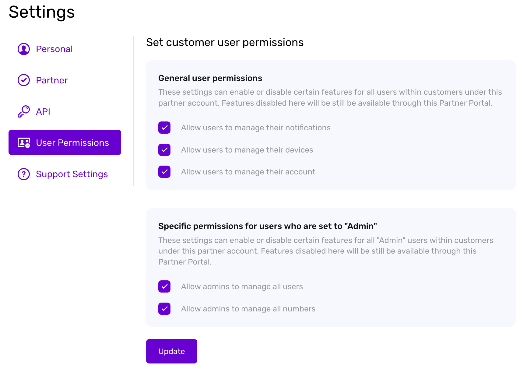 Please note! PhoneLine+ is licensed at a user level. Please be aware that by ticking the box to allow Admin customers to manage all users, your customers can add additional users themselves, incurring additional charges. Please be sure your customers are aware of this if you choose to allow this function.